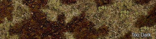 Since this system creates sharper transitions between landscape textures, it's especially important that you make smart decisions about which textures to layer together. The greater detail can reveal some bad combinations that just got smeared together in the old fashioned shader system. There are two important concerns to keep in mind: levels, and pattern.